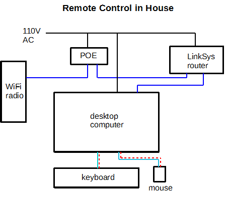 The organization of the hardware and software for remote operation is illustrated in the next diagram. With this setup, IP addresses are supplied via DHCP by the Linksys router.