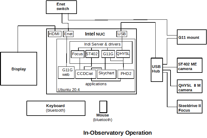 The system is designed so that it may be operated either from within the observatory or remotely from the house. The choices made for the operating system, the drivers which actually interface to the equipment and the control applications were made so as to facilitate running in either mode with a minimum of differences between them. The choices then are: the Ubuntu 20.4 operating system and the Indi system of device drivers running via the Indi Server which can be operated either locally or over the local area network. The control applications which are optimal are the following. The Gemini II dedicated control computer incorporates a web interface which enables the most comprehensive control of the Losmandy G11 mount. It accessed via a web browser and is accessible only over ethernet. Patrick Chevalley's "Skychart" planetarium and his "CCDCiel" camera control application work well together and also work with the PHD2 guiding software. The PHD2 guiding software is primarily an old-fashioned ASCOM application, but Patrick Chevalley has ported it to Linux. The details of how these application work are described in great detail in their documentation and will not be discussed here.