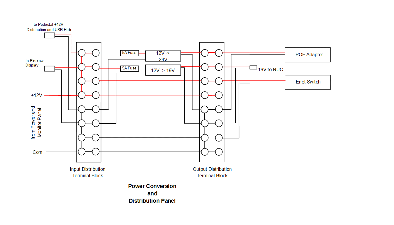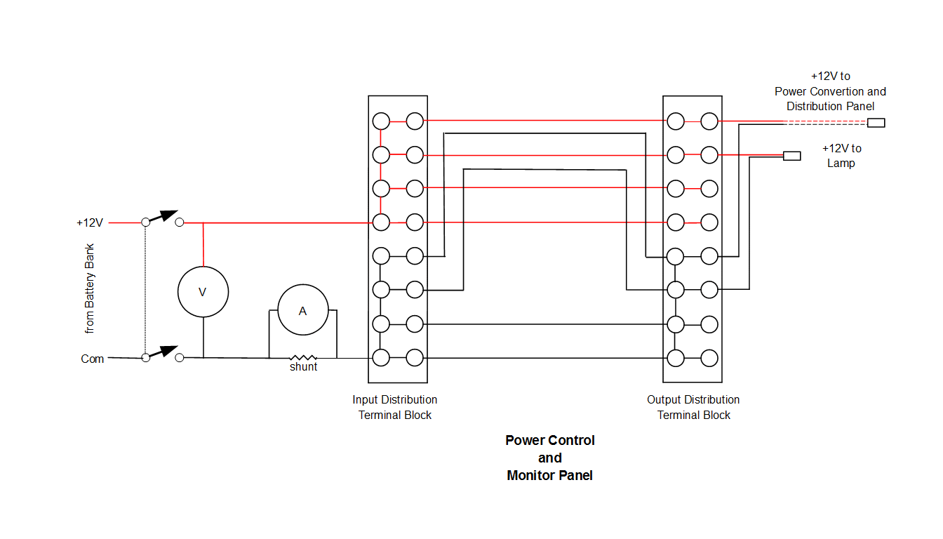 The overall configuration of the equipment in the observatory is illustrated in the diagram above. Electrical power is supplied by a 12V battery bank which is kept charged by a small 100W solar panel. The 12V supply has a simple power control and monitor panel power control and monitor panel which enables power on-off for the entire observatory and continuous monitoring of the supply voltage and current being consumed. A separate power conversion and distribution panel which is closer to the equipment converts the 12V to the other voltages that are needed: 24V for the WiFi radio to the house and 19V for the Intel NUC mini-computer that controls all the other equipment. That panel also carries the ethernet switch and the power-over-ethernet adapter that powers the WiFi radio.