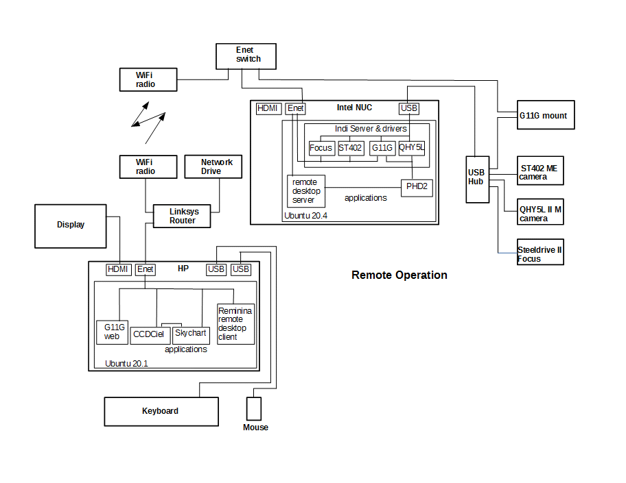 The key component is an HP desktop computer that runs the Ubuntu operating system when remotely controlling the observatory. The local area network is governed by the Linksys router which supplies DHCP addresses to the equipment. The WiFi radio is the link to the observatory.