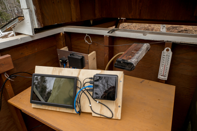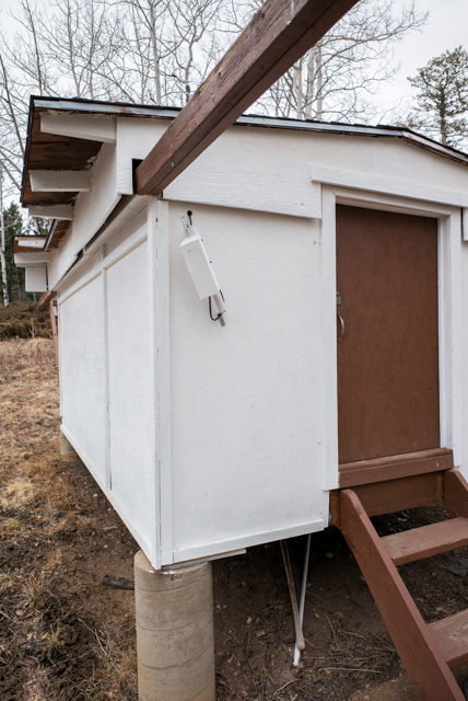 The small white boxes in these photos are the ethernet/WiFi radio links between the observatory and the house. They are a pair of TP-Link CPE200 WiFi radios. The one attached to the outside observatory wall receives both power-over-ethernet and data via an ethernet cable from the ethernet switch via a POE adapter. The radio at the house is fastened to the outside wall of the screened porch, and a cable leads through the walls of the porch and then of the house and into the study where it feeds through a POE adapter and then to the LinkSys router that controls the local network. The router also provides an internet connection via the antenna seen at the top of the gable at the end of the house, so the internet is accessible from both the house and the observatory.