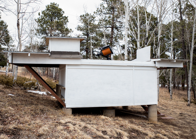 Magnolia Observatory is located in Boulder County, Colorado USA at 8350 feet (2500 meters) above sea level. The observatory is a thin-walled wooden box having a wooden floor which is 8x12 feet, and the walls are four feet high. The box is perched one to three feet above the sloping mountainside atop four concrete posts. Each post sits on a rectangular concrete footing three feet below ground level. The roof has a cupola over the telescope pedestal, and the roof splits to roll off with the two portions moving in opposite directions. The walls are four feet high to afford a good view of the sky and of the area surrounding the building.