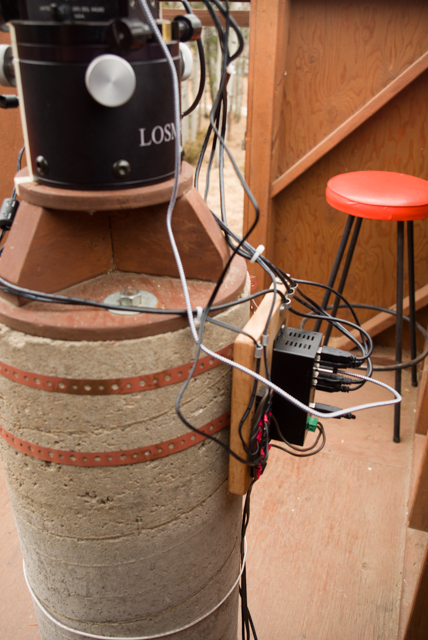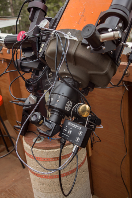 There are only three cables which run to the pedestal: 12V, USB and ethernet. This photo attempts to show where they go when they reach the pedestal. The 12V goes to a power distribution terminal block and from there individual cables go to the other instruments that need a 12V supply: the USB hub, the Gemini II and mount, the ST-402ME camera/wheel and the focuser motor. The USB cable goes to the USB hub where the USB signals for the different instruments are repowered and then sent over individual cables to their destinations: the Gemini II and mount, the ST-402ME camera/wheel, the focuser motor, the QHY5L_II camera and the Nikon D600 or Leica M8 camera. The ethernet cable goes directly to the Gemini II and mount.