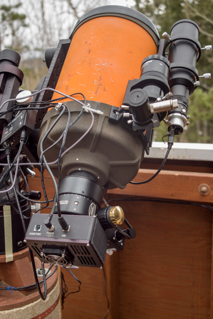 This photo shows the C8 when set up for photometry. The camera is a SBIG ST-402ME camera having an internal filter wheel that carries B,V and I photometry filters as well as an unfiltered Clear aperture. That photometry wheel can be switched with a second filter wheel that carries standard R, G and B filters for making standard color-separated photos. The camera includes a thermoelectric cooler capable of reducing the camera chip's temperature by as much as 30 °C below ambient in order to facilitate low thermal noise in images made with long exposures. The camera is provided with 12V and is controlled via USB. With this camera installed, the telescope with all attached equipment comes to about 30 pounds, a consevative half of the maximum that a G11 mount is capable of handling.
