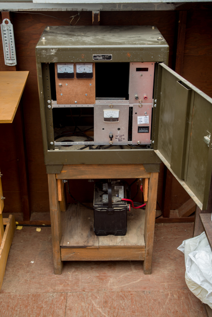 Electrical power for the observatory is supplied by 12V lead-acid batteries under the instrument cabinet. The brown control panel in the cabinet switches the 12V supply on and off and measures the voltage and the amperage being used. The other panels in the cabinet provide the power control and tracking rate control for the C8's original fork mount.