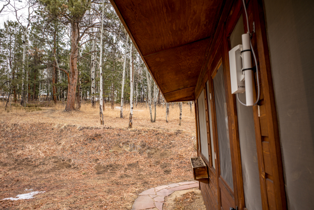 This photo shows the view toward the observatory from the house. The observatory, some 300 feet up the mountain from the house, can just be glimpsed as the white form behind some small tree trunks about halfway from the center of the photo's left edge to the nearest big pine tree. There is enough clear space through those intervening trees that the WiFi radio signal is transmitted with good fidelity and bandwidth.