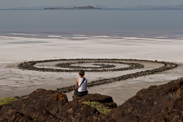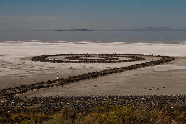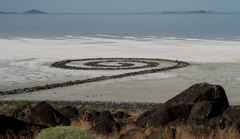 Spiral Jetty is a work of land art which was constructed in 1970 by US artist Robert Smithson (b1938-d1973). The installation is located on the northeast shore of the Great Salt Lake of Utah, USA. Spiral Jetty is built of black basalt rocks from the land surrounding the Great Salt Lake. The rocks are arranged in a counter-clockwise Archimedes spiral which juts out from the highest shore of the lake near Rozel Point. The jetty is about 15 feet or 5 meters wide and runs for nearly 1500 feet or 460 meters including the "stalk" which connects it to the shore.