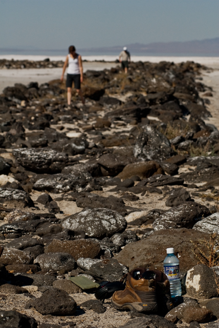 In 2010, when these photos were made, a drought had caused the lake to receed from the shore leaving a wide band of salt between the shore and the water. The jetty can be negotiated on foot except when the water level is high and the jetty is submerged. The black basalt rocks were bare when moved from the surrounding area to build the jetty, but now some still retain a coating of salt from previous high water levels. Barring an unlikely flood that raises the lake level and buries it, the jetty will perhaps survive for millennia in the dry desert climate.
